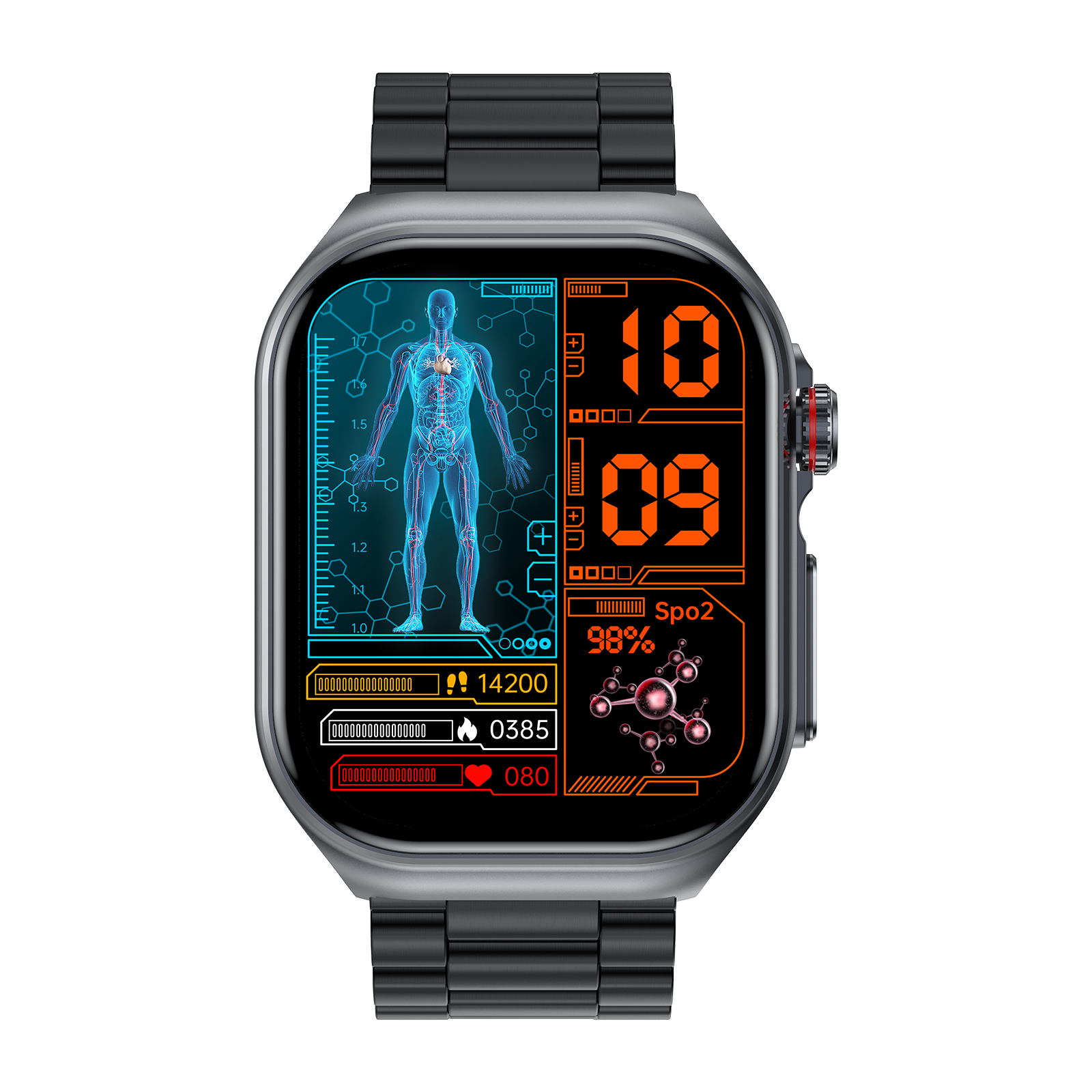 Jam Pintar ECG ET585 menggabungkan penjejakan kesihatan lanjutan dengan ciri keselamatan peribadi . Ia termasuk pemantauan ECG , pengesanan glukosa darah bukan invasif , tekanan darah dan pemantauan SpO₂ untuk memberi anda cerapan yang tepat tentang kesihatan anda.